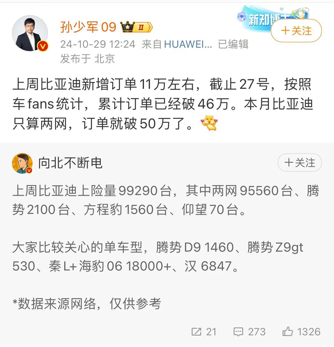 10月29日,据博主@孙晓军09消息,上周,比亚迪汽车的新增订单量达到了约11万台,截至27号,根据车fans的统计,累计订单量已经突破了46万台。
