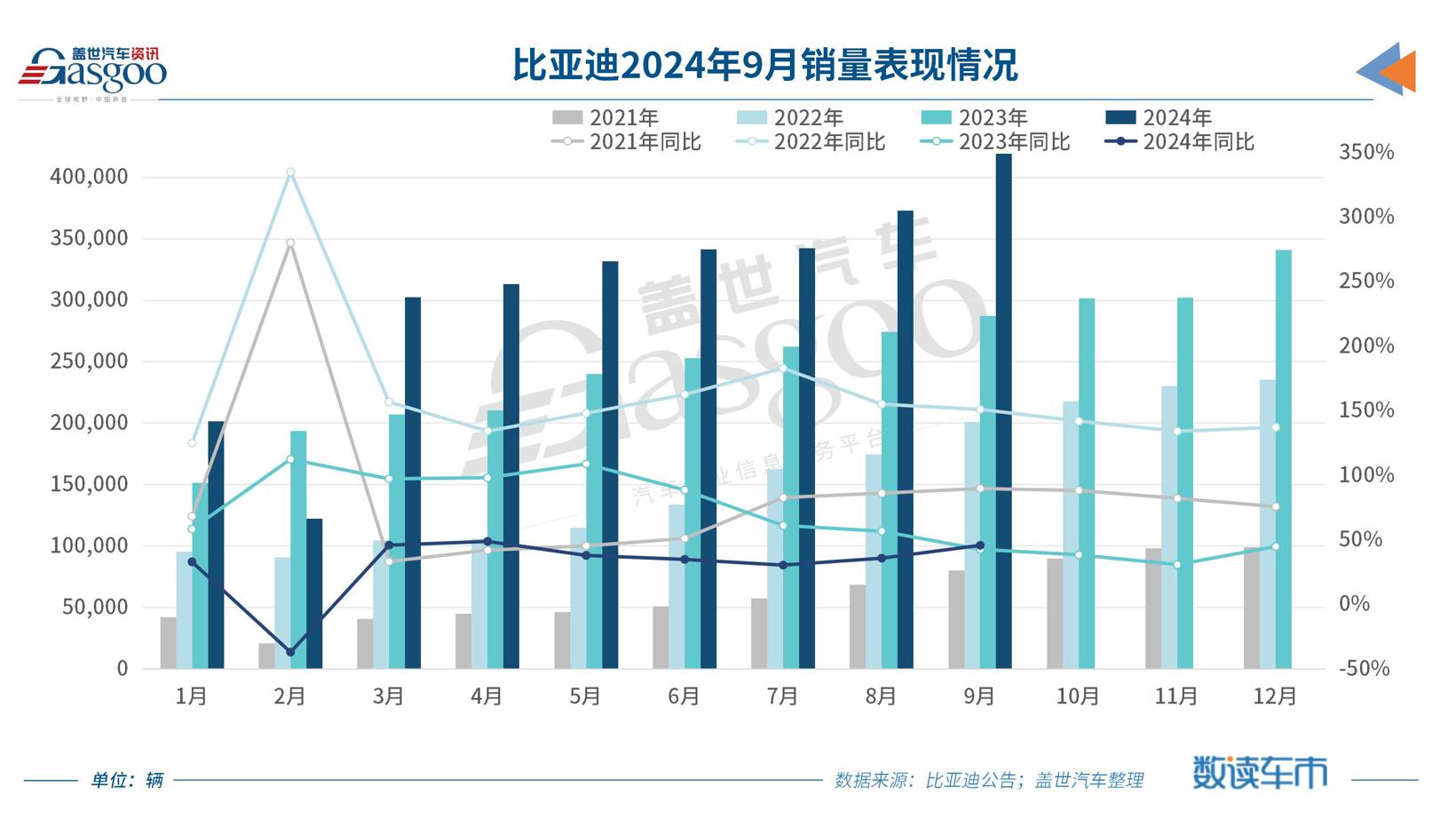 而后在9月,比亚迪合计销售419,426辆新能源车,较去年同期增长45.91%,环比8月增长12.42%,这是比亚迪月销首次突破40万辆。