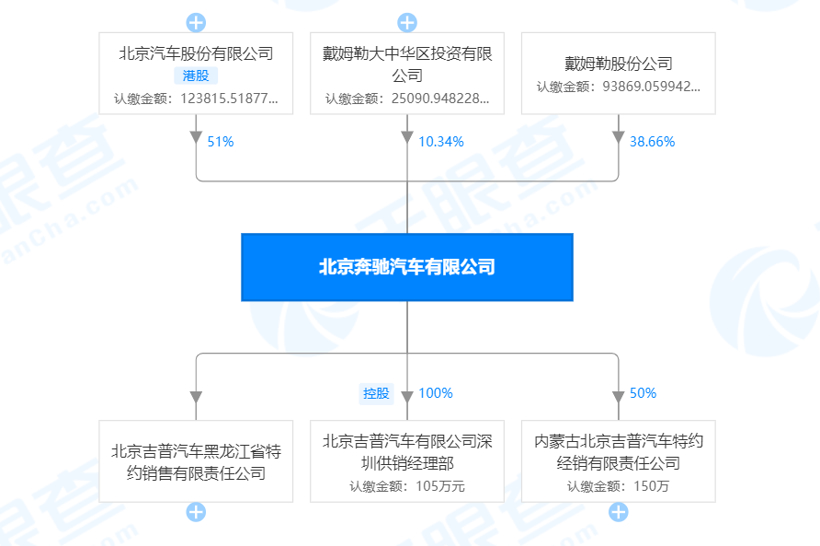公开资料显示,成立于2005年的北京奔驰是北京汽车股份有限公司与戴姆勒股份公司、戴姆勒大中华区投资有限公司共同出资组建的合资企业,在股权结构上,北京汽车持股51%,戴姆勒持股49%。