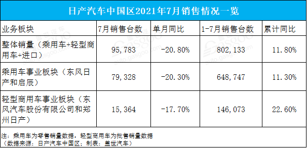 8月4日,日产汽车公布7月销量数据称,在新冠病毒肺炎疫情、原材料短缺以及自然灾害等外部环境的影响下,日产汽车中国区含乘用车和轻型商用车两大事业板块在内的7月销量为95,783台,同比下降20.8%。1-7月累计销量为802,133台,同比增长11.8%。