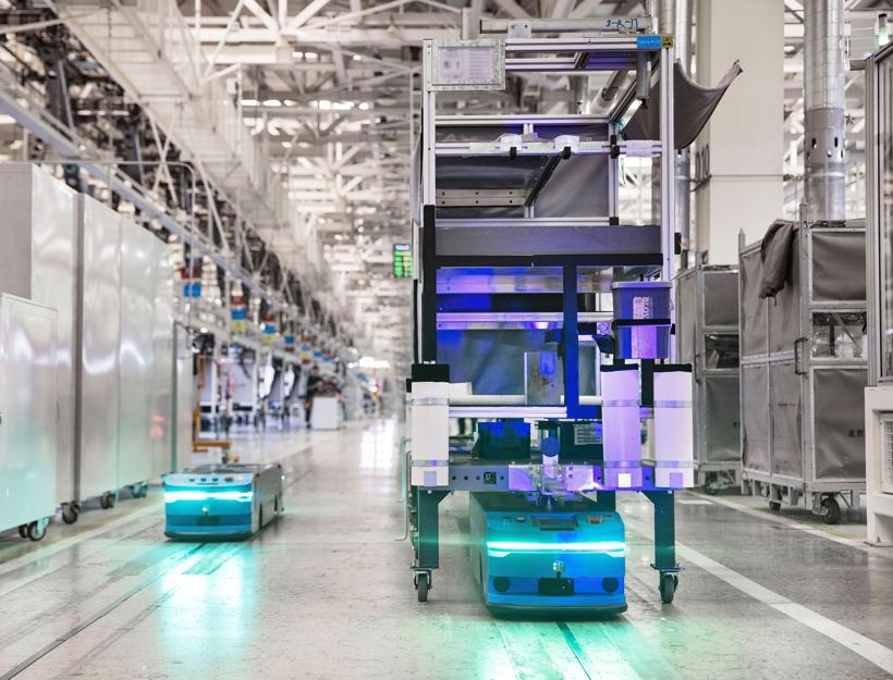 在总装车间,自动物流机器人会以编程好的统一速率将待装车和餐车统一运送,餐车上配备了每台待装车辆所需的所有特定零部件。