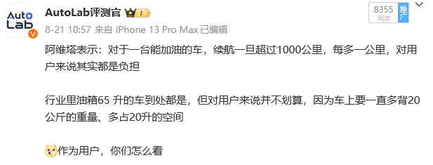 前两个月参加阿维塔增程发布会的时候,在微博上分享了阿维塔对于油箱和续航的一个观点。
