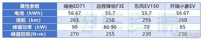 核心三电性能上,这四款产品的电池容量及续航里程其实也相差不大,均过了250公里,整体的动力性能都非常不错。唯一不同的是瑞驰ED71的最大扭矩达到270N·m,意味着车辆在拉重物或者爬坡时的力气越大,负重能力更强。