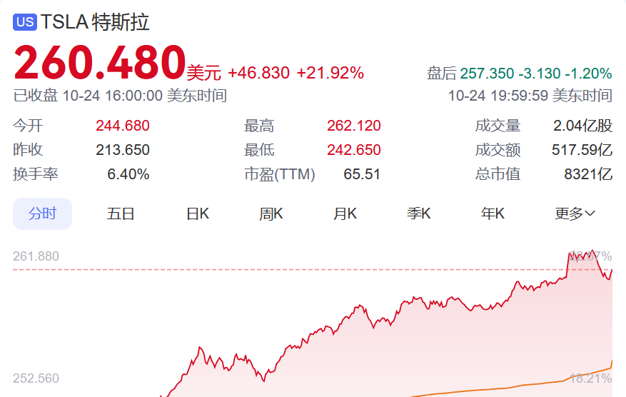 10月24日,特斯拉股价收盘上涨21.92%,最终收于260.48美元。