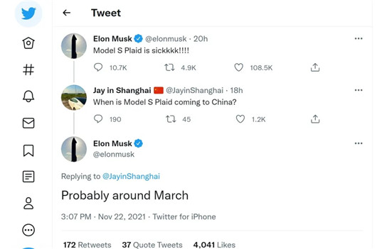 当一名来自中国的推友询问:“Model S Plaid几时入华?(When is Model S Plaid coming to China?)”马斯克给了一个瞬间四千点赞的答复:“可能在明年3月(Probably around March)。”